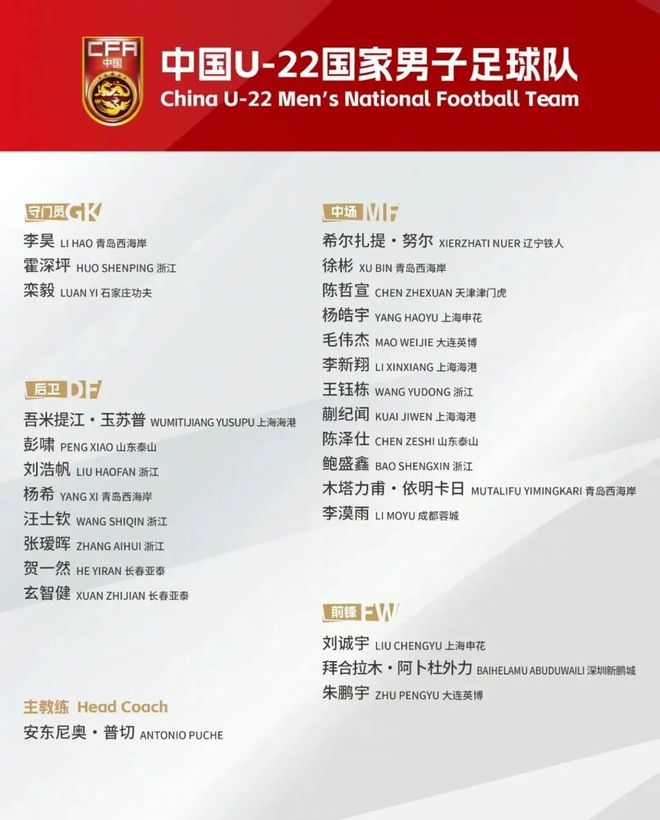 10月2日,中国足球协会宣布了新的U22国家男子足球队名单,并去了云南省昆明市组织培训并参加了10月6日至15日的热身比赛。其中,选出了由Taizhou训练的足球明星Wang Yudong。具体列表如下:管理员:Huo Shenping(Zhejiang团队),Li Hao(Qingdao West Coast),Luan Yi(Shijiazhuang Kung fu)守卫:Wumi Tijiang Yusupu(上海港口) Zeshi (Shandong Taishan), Chen Zhexuan (Tianjin Jinmen Tiger), Bao Shengxin (Zhejiang Team), Mutalifu Yimingkari (Western Coast of Qingdao), Mao Weijie (Dalian Yingbo), Hierzati Nuer (Liaoning Man) Harbor), Liu Chengyu (Shanghai Shenhua),Li Moyu(Chengdu Rongcheng),Wang Yudong(Zhejiang Team),Baihelamu Abuduwaili(YENZHEN XINPENGCHENG),Zhu Penguyu(Dalian Yes Yes Yes Yesbo)Taizhou Xuelu Xuelu Xuelu Xuelu Xuelu oder School and Jiaiaojiang区。在JUNE 2018,他加入了Taizhou鸵鸟足球俱乐部。 2019年,王·尤东(Wang Yudong)被选为国家青年队; 2021年,他成为了“国家”常规赛,并与惠江团队进行了尝试和竞争。 2023年7月,他正式签署了智格队。 2023年12月2日,王·尤东(Wang Yudong)在第二届中国青年足球联赛中赢得了U17冠军,他与Zhejiang U17 Green Team的男子高中年龄组U17赢得了U17冠军; 2024年2月,王·尤东(Wang Yudong)赢得了2023年中国黄金男孩奖的2023年中国金球奖奖; 2025年1月,Wang Yudong被选为U20国家橄榄球队训练名单,并在亚洲杯比赛的最后三场供暖中被完全被解雇。他对韩国的Yonsei University,泰国的曼谷联合U23和乌兹别克斯坦国家青年队进行了每场比赛,帮助Theteam取得了2次胜利和1场平局; 2025年6月,他在世界杯决赛的最后一场比赛中对巴林进行了点球命中,这是他的首个进球E代表国家橄榄球队。资料来源:体育周刊