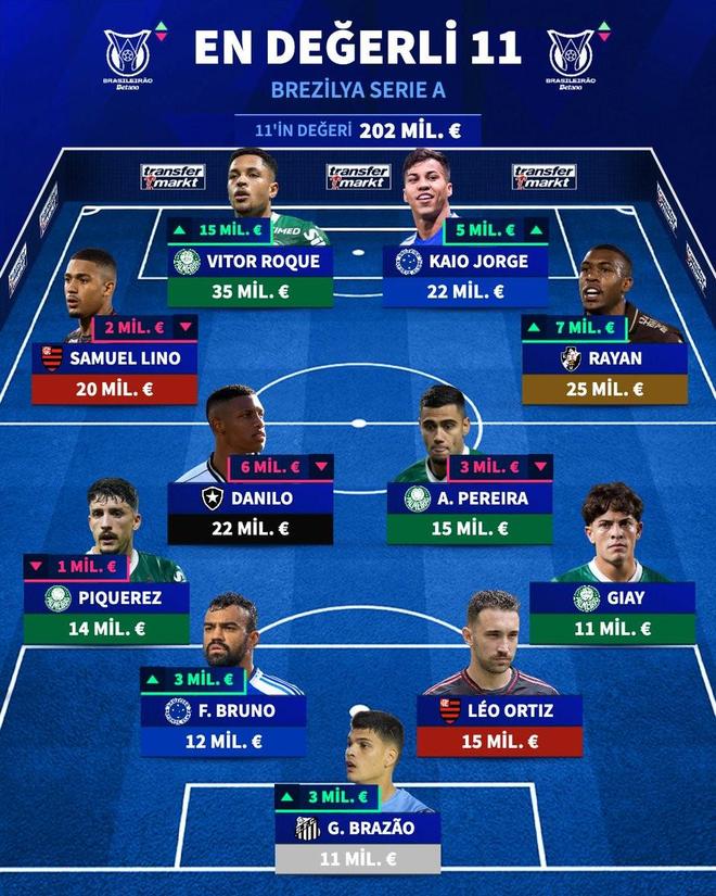 北京时间12月11日,在更新巴西球员身价后,德专还列出了目前巴西联赛最贵的11人阵容,由维托尔·罗克领衔,身价为3500万欧元。阵容中还包括前尤文图斯球员凯奥·豪尔赫、前马竞球员利诺、前曼联球员安德烈亚斯·佩雷拉和前国际米兰球员布拉赞。德国赴黎巴嫩联赛球员身价更新后最贵11人阵容:主教练布拉赞(桑托斯)1100万欧元(+300万欧元)、后卫贾伊(帕尔梅拉斯)1100万欧元、利奥·奥尔蒂斯(弗拉门戈)1500万欧元、法布里西奥·布鲁诺(克鲁塞罗)1200万欧元(+300万欧元)、皮雷斯(帕尔梅拉斯)1100万欧元欧元(Euros),中场球员拉扬(瓦斯科达伽马)2500万欧元(+700万欧元),安德烈亚斯·佩雷拉(帕尔梅拉斯)1500万欧元(-300万欧元),达尼洛·利诺(博塔弗戈)2000万欧元(-200万欧元),维托·罗克(帕尔梅拉斯)3500万欧元uro(+1500万欧元)总价值:2.02亿欧元【咪咕独家观看英超联赛】