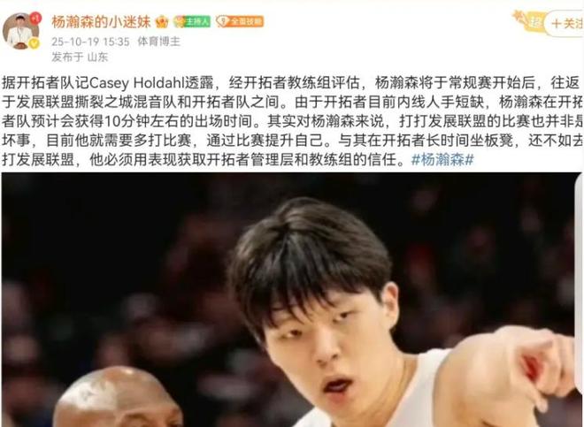 近日,网上有关于开拓者队的消息,球队记者Casey Holdahl宣布杨汉森新赛季将被送往发展联盟。内容非常详细,就像真实的一样。消息来源来自下图中的用户。文章发表后,他又删帖了!对于这个消息,有粉丝去找Casey Holdahl求证,Casey Holdahl在国内有账号!他亲自回应称,杨汉森目前是球队的替补中锋。除非情况发生变化,否则杨汉森不会被交付!所以这个消息已经非常明确了。记者并没有说杨汉森新赛季一定会去发展联赛。就算他去了,最多也只是几场比赛,因为开拓者队除了克林根和杨汉森之外,洛韦都受伤了,里斯也无法重用!如果真的需要下放杨汉森,球队就没有多少中锋可以使用了。如果你你选择杨汉森,一定要好好培养他,给他足够的时间。在所有的集训计划中,代表团去发展联盟绝对不在计划之内!除非杨汉森连续几场比赛表现低迷,洛威回归后发挥出色,否则杨汉森可以下放,给予足够的比赛时间磨合,方便交易,仅此而已。在开拓者队内线中,杨汉森和克林根始终是重要的培养对象!
